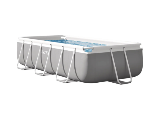 La Piscina estructural rectangular INTEX Prism Frame tiene una estructura metálica, compuesta por piezas tubulares independientes con tratado anticorrosión y antióxido a base de pintura epoxi en la parte exterior. Los tubos en forma de prisma están ensamblados unos con otros a través de un nuevo sistema de unión en “T” que garantiza un montaje fácil y hermético que evita la formación de óxido interno. Las barras de acero se unen al marco metálico sujetando la lona triple capa de PVC-Poliéster extra resistente formando un armazón rígido y estable que la convierte en una piscina resistente y duradera. Esta piscina tiene un diseño con la pared exterior en gris claro con las barras en blanco y una pared interior con un mosaico que imita el gresite en azul.